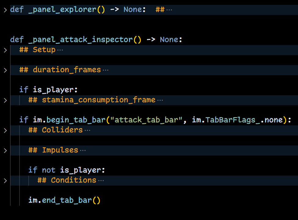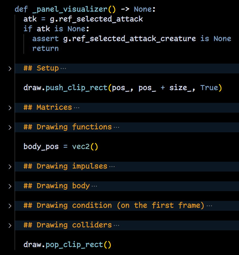 - Безумие moment. Ходят легенды, что я в одном файле писал геймплей + рендер клона brotato. 14к+ строк. И довел игру до конца. Хочу этим сказать, что с помощью грамотных fold-ов, похоже, можно в голове удерживать намного более обширную картину происходящего в коде